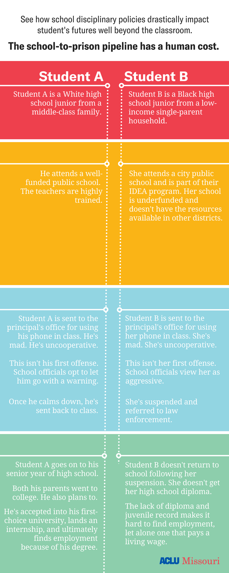 The result is clear. While Student A walks down the aisle on graduation day, Student B sits in a juvenile detention center. She has been unfairly removed from her peers, and from opportunities she cannot get back.